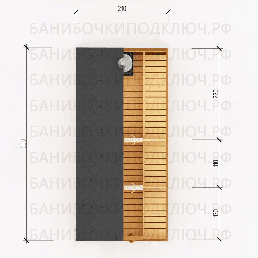 парилка - 220 см, мойка - 110 см, предбанник - 130 см